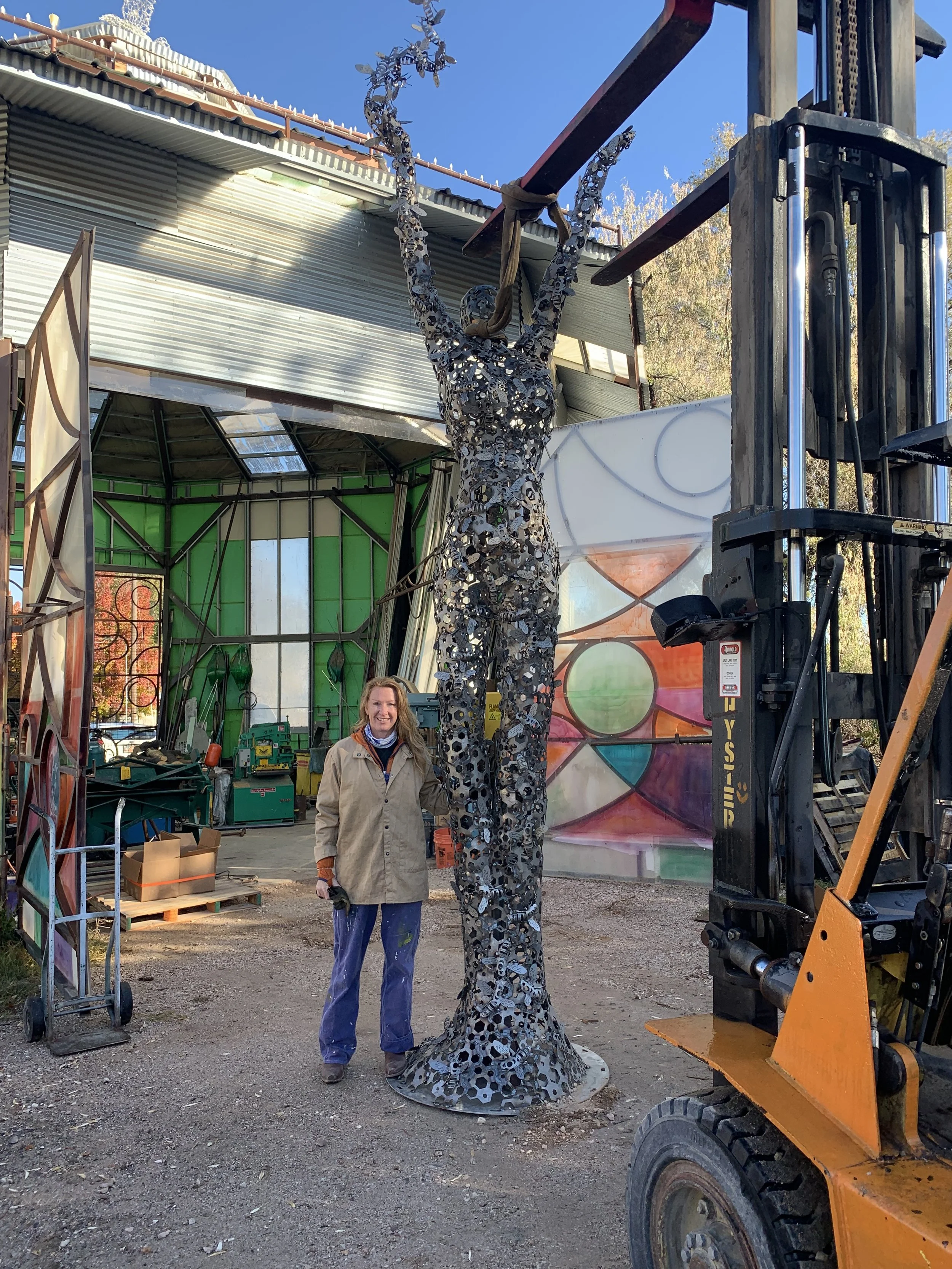Now entering a new chapter as an empty nester, Ashley is embracing a season of expansion and adventure, allowing her art to move more freely into the world. Her work — often embodied through her Tree Ladies and Freedom Dancers — explores growth, resilience, and the freedom that comes from rooting deeply while reaching outward. Whether creating alone in her studio, teaching workshops that center the creative process as a tool for healing and connection, or taking her work on the road through festivals and collaborative builds, Ashley is devoted to empowering others to trust their creative voice and truly enjoy the act of making.
